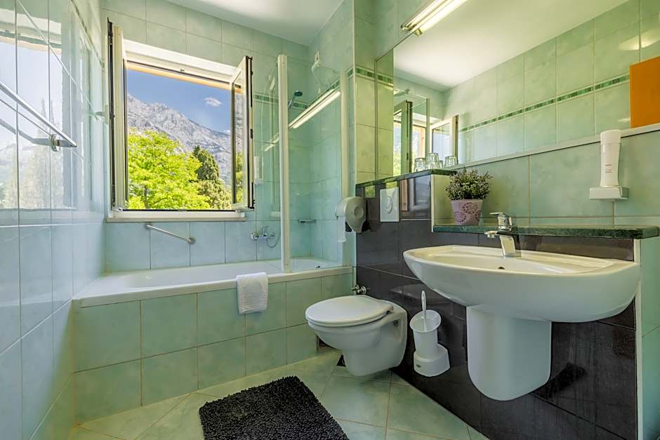 The spacious studio features a beautiful view over the city of Makarska, Biokovo Mountain and Adriatic Sea. No balcony.